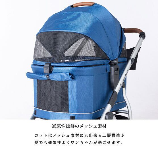 コット下にはお水やおやつなどのお散歩用グッズをたっぷり収納できる「荷物入れ」や、小物も入るボトルホルダー等おでかけにぴったりの装備と、飛び出し防止用リードフック・メッシュ素材にも出来る二層構造のコットで機能性も抜群です♪
